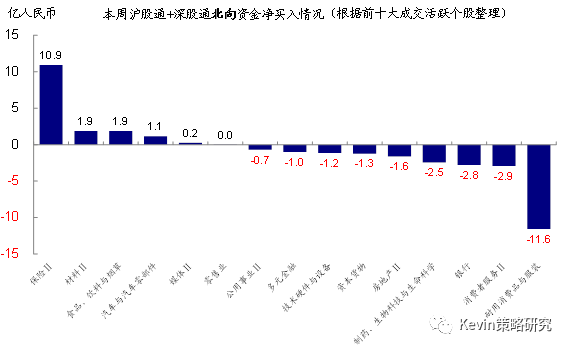 个股层面,根据十大成交活跃个股的资金流向情况统计来看,本周北向资金流入中国平安(10.9亿人民币)、海螺水泥(2.7亿人民币)、伊利股份(2.6亿人民币)等;但流出家电(格力电器,3.9亿人民币;美的集团,3.6亿人民币),同时也流出中国国旅(2.9亿人民币)、大族激光(2.5亿人民币)、恒瑞医药(2.2亿人民币)等。