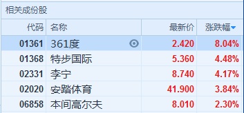 智通财经APP获悉,体育用品股集体造好,截至14时02分,361度(01361)涨8.04%;特步(01368)、李宁(02331)均涨逾4%;安踏体育(02020)涨3.84%;本间高尔夫(06858)涨2.3%。