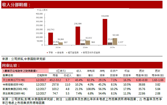 经营业绩方面,集团营业收入增长较快,2015年至2017年的增长率均超过40%,主要由于来自学费的收益增加所致。同时,集团的毛利、除税前溢利和期内溢利均保持上涨。集团的净利润率也逐年上涨,由2015年的8.37%上升至2017年的29.11%。主要由于业务增长所致,其次由于2017年自地方政府机关收取有关营运成本的额外政府补助所致。