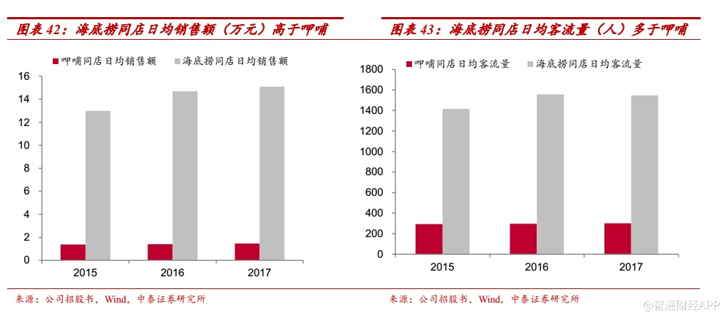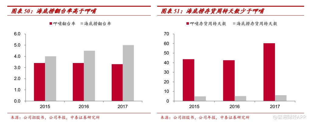 ①海底捞翻台率持续高于呷哺,2017年海底捞翻台率为 5,呷哺为 3.3,主要是由于海底捞更长的经营时间,呷哺的营业时间为 12 个小时,而海底捞的营业时间达到 17 个小时,有些门店甚至达到 20 个小时。