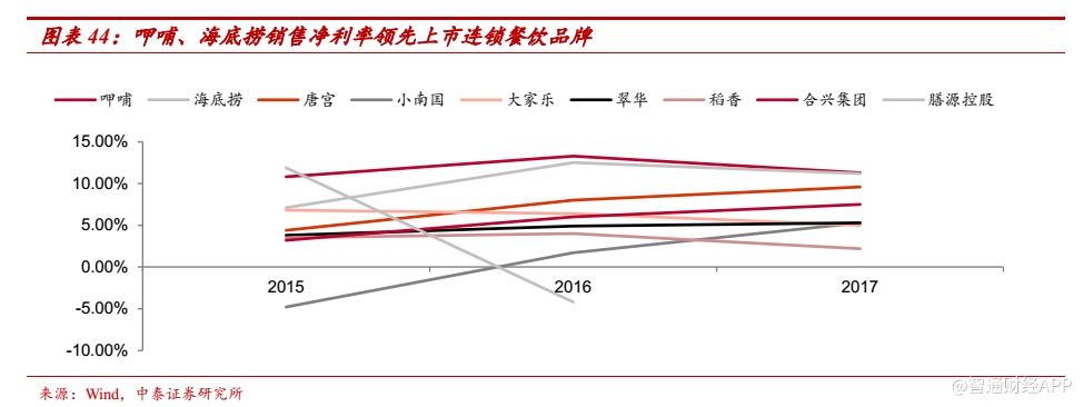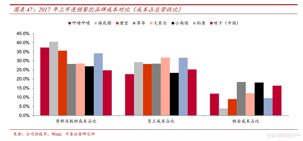 ②呷哺的员工成本占比为 22.7%,在上市餐饮品牌中具有最强的员工成本控制能力,这主要是由于呷哺快速休闲小火锅的商业模式对员工总数的要求较低,对员工培训、店长综合素质的要求不高,员工仅需提供标准化的服务,店长经过 1 年左右的培养即可任职;海底捞的员工成本较高,占比达到 29.3%,主要是由于海底捞独特的薪资激励机制,对于员工及店长的要求均较高,同时店长作为门店开拓的关键驱动因素,需要 4 年左右的培养时间。