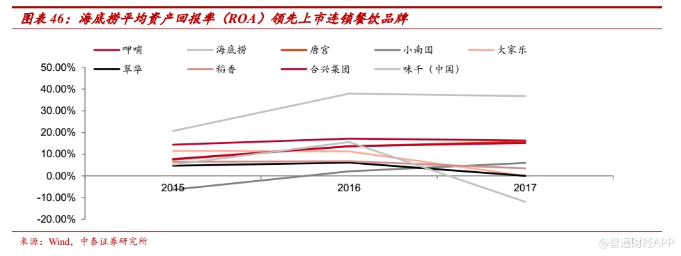 海底捞、呷哺盈利能力领先上市餐饮品牌。2015、2016、2017 年呷哺的净利率分别为 10.8%、13.3%及 11.3%,持续领跑上市餐饮品牌,海底捞以 7.1%、12.5%、11.2%的净利率紧随其后,盈利能力同样远超其他餐饮品牌。股本回报率、资产回报率方面, 2017 年海底捞 ROE 为 110.4%、ROA 为 36.8%,遥遥领先于其他上市餐饮品牌,一方面主要是由于海底捞供应链、调料生产厨房等重资产均为体外关联公司,另一方面是由于海底捞流动负债水平较高,流动比率仅为 0.56;呷哺的 ROE、ROA 分别为 22.7%、16.3%。超强的经营效率、快速的营收增长及有效的成本控制是海底捞和呷哺盈利能力突出的关键因素,因此接下来,我们就这几方面进行对比研究。