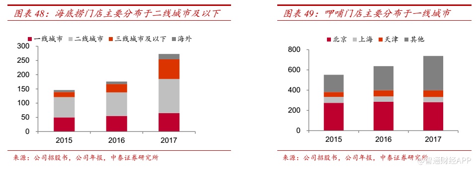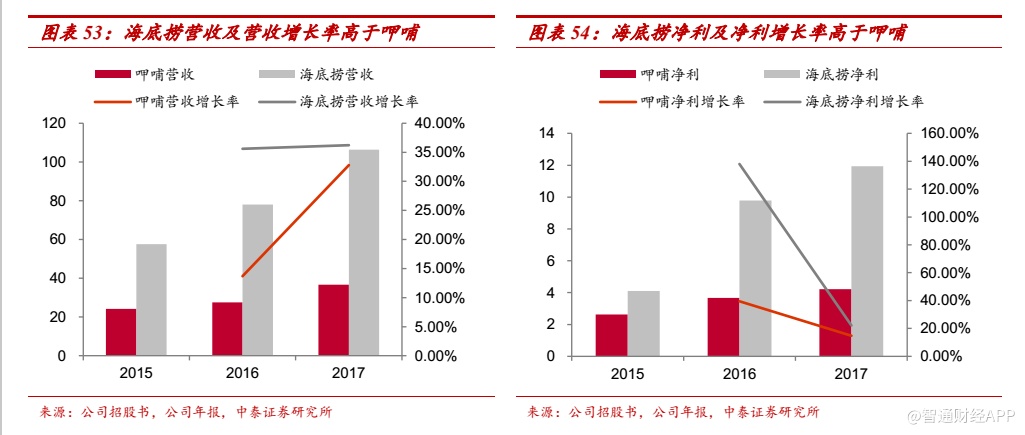 虽然两者的目标市场趋于一致,但我国中高端火锅市场空间广阔,很难出现直接的激烈竞争。近年来,呷哺推出呷哺 2.0 及湊湊系列,不断进行品牌升级,意图进入中高端火锅市场,2017 年湊湊占呷哺总营收的3.2%,对呷哺的盈利贡献尚小,加之 21 家门店中的 14 家于 17 年第四季度开业,湊湊 17 年亏损 2490 万元,未来随着门店的成熟、品牌的培育及餐厅的扩张,我们相信湊湊将成为呷哺的重要发展驱动力。与此同时,海底捞在中高端市场经验更加丰富,运营效率也更有优势,未来在两者门店重叠的区域,更高的经营效率、更有吸引力的产品组合等都是取得成功的关键,目前形势下,湊湊的经营效率、中高端火锅运营经验稍逊于海底捞,未来我们也期待两家餐饮龙头企业更好的表现。
