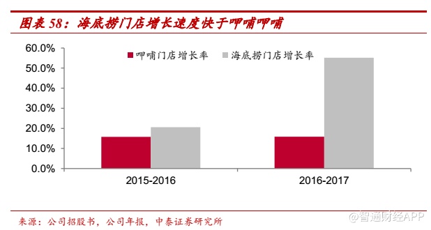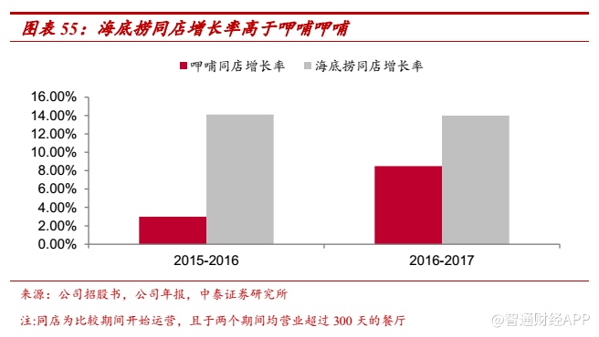增量方面,近两年海底捞的门店增长速度均快于呷哺,2017 年海底捞的门店增长率为 55.1%,呷哺的门店增长率为 15.9%。