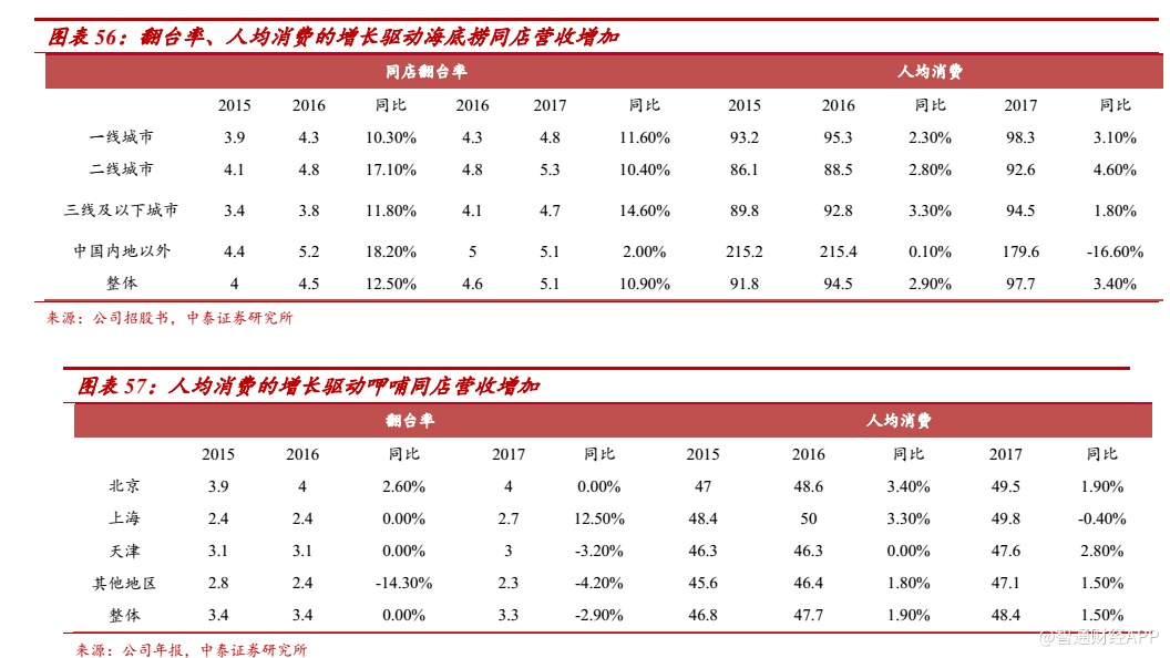 海底捞内生/外生增长率高于呷哺。总体来看,近两年海底捞的营收及净利增速均高于呷哺,2017 年海底捞营收、净利增速分别为 36.2%、22.1%,呷哺的营收、净利增速分别为 32.8%、14.7%。存量方面,近两年海底捞的同店增长率均高于呷哺,2017 年海底捞的同店增长率为 14%,呷哺的同店增长率为 8.5%。呷哺的同店增长主要来自餐厅升级,菜单提价驱动人均消费上升;海底捞较快的同店增长率则主要是由于翻台率提高较快,其中三线及以下城市翻台率的拉升作用最为明显,门店下沉初见成效,此外,菜单提价也带来客单价的提升也带动了同店增长率的上升。