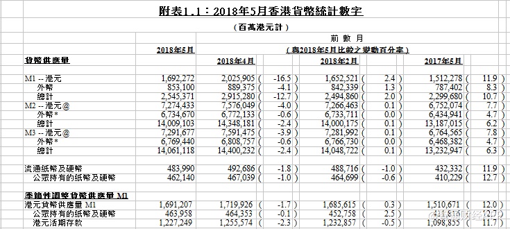 经季节因素调整后,5月份港元货币供应量M1下跌1.7%,与去年同期比较则增加12.0%。未经季节因素调整的港元货币供应量M3于5月份下跌3.9%,与去年同期比较则增加7.8%。