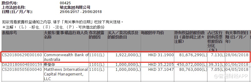 澳洲联邦银行增持敏实集团(00425)192万股,每股作价31.19元