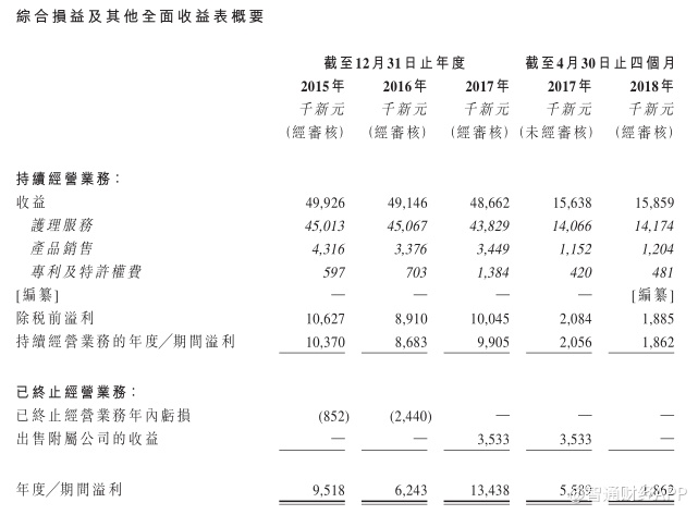 财务数据方面,截至2017年12月31日止三个年度以及2017财年首四个月及2018财年首四个月,护理服务产生的收益分别约为45.0百万新元、45.1百万新元、43.8百万新元、14.1百万新元及14.2百万新元,分别约为占公司在相关年度/期间的总收益的约90.2%、91.7%、90.1%、89.9%及89.3%。