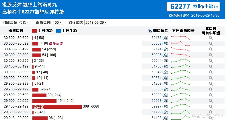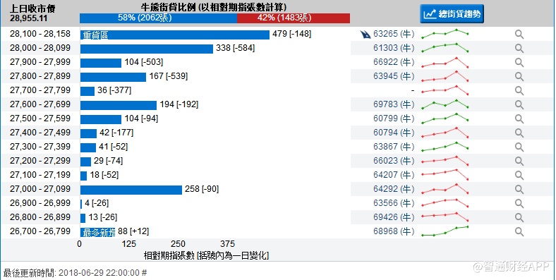智通财经APP获悉,截至6月29日,恒指最新的牛熊街货比例为58:42。从瑞信恒指牛熊证街货分布图中得到的数据显示,熊证街货重货区在29400-29499区间,此区间最新的熊证数量为308张,比上一交易日减少668张,最多新增落在30500-30599区间。牛证中重货区在28100-28158区间,该区间最新牛证数量为479张,比上一交易日减少148张;最多新增落在26700-26799区间,该区间最新牛证数量为88张,比上一交易日增加12张。