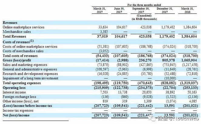 受大幅扩张市场需要,拼多多在2018年Q1的销售与市场支出达到12.17亿元,平台单季发生2.01亿元人民币净亏损。