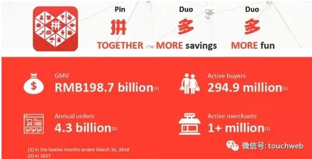 与此同时,截至2018年3月31日止的12个月内,拼多多平台活跃商户数量超过100万家,为客户提供全品类商品。