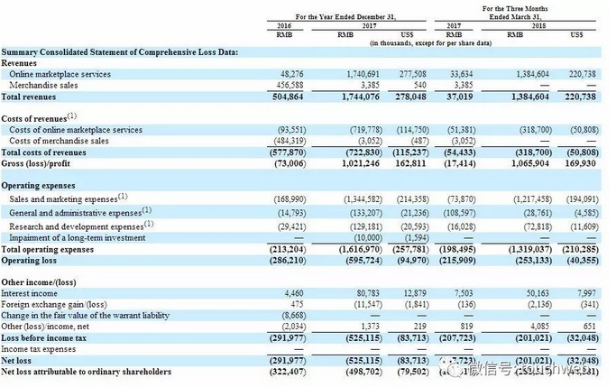 2016年收入为5.05亿元人民币,2017年全年收入为17.44亿元人民币,2016年和2017年分别发生2.92亿元人民币和5.25亿元人民币净亏损。