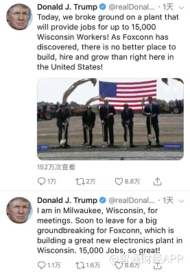 智通财经APP获悉,6月28日,特朗普和郭台铭出席了富士康在美国威斯康辛州新工厂的动工奠基仪式,对此,特朗普连发数条推特称,富士康在威斯康星州建造的新工厂太不可思议了,这将为当地带来约1.5万个工作机会。