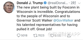 据外媒消息,这个工厂是由当地州政府以40亿美元的高昂补贴换来的。特朗普也在推特里怒赞“祝贺威斯康星州的人民和州长Scott Walker及他有才的手下们把这事办成。干得漂亮!”