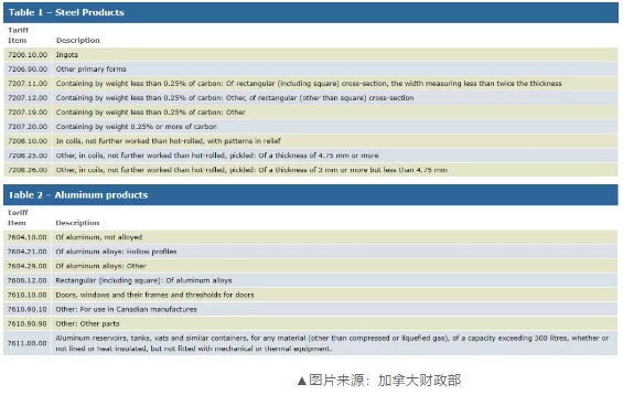 此次加拿大政府共对要征税商品列出了三份清单,其中第一份清单主要为钢铁及其制品,这部分要征收25%的额外关税,第二份为铝及其制品,第三份则为其他产品,这两份清单上的产品将被征收10%的额外关税。