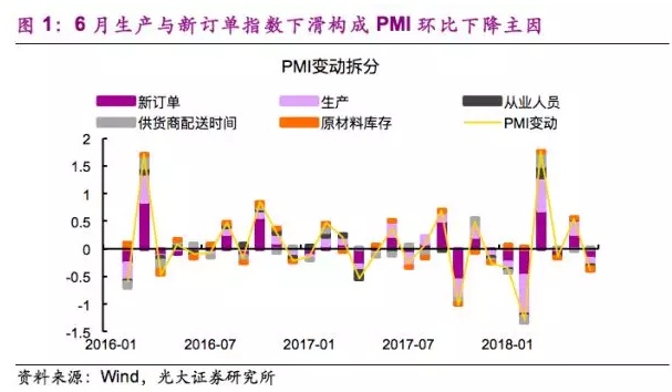在中国“紧信用”的大背景下,需求和生产均回软,PMI较上月回落0.4个百分点至51.5%,较去年同期低0.2个百分点,低于市场预期。其中,新出口订单PMI指数较5月下降1.4个百分点;新订单、生产PMI指数分别低于上月0.6、0.5个百分点,从业人员、原材料库存分项指数分别低于上月0.1、0.8个百分点;供货商配送时间PMI相较上月小幅上升0.1个百分点。总体来看,生产和新订单指数对PMI指数下滑拖累最大(图1)。