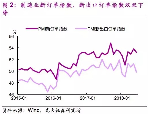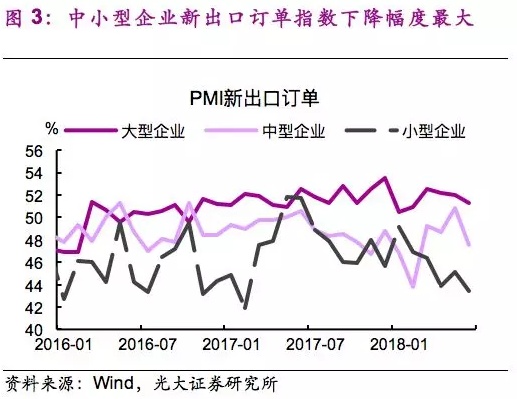 外贸抢跑可能结束,6月新出口订单较5月下滑1.4个百分点至49.8%,也较去年同期下滑2.2个百分点,可能意味着贸易抢跑的行为将开始减弱,贸易压力可能逐渐显现(图2),从出口订单数来看,中小型企业出口订单指数下降幅度最大(图3)。特朗普政府将于7月6日开始对中国340亿美元的商品加征关税,贸易抢跑行为开始减弱,最先就体现在订单下滑上。