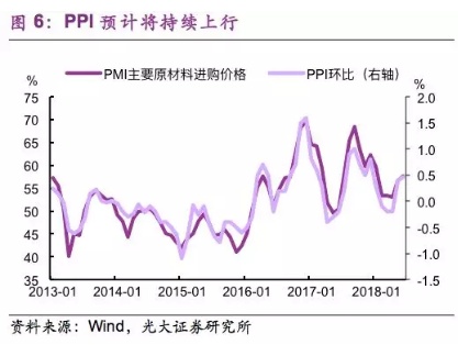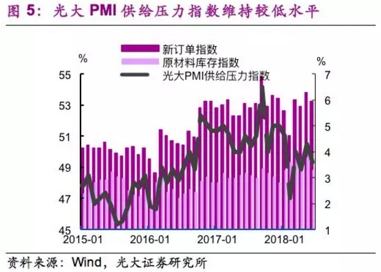 6月光大PMI供给压力指数则继续维持在2017年以来的低位,相比5月,下降0.7个百分点至3.6%(图5),供给侧改革的力度相对平缓。制造PMI数据中,6月原材料库存和产成品库存差距继续扩大态势,也表明供给端压力相对不大。