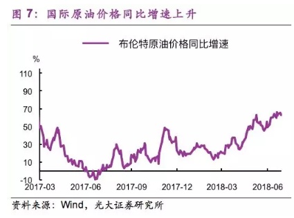 6月PPI通胀预计继续回弹。制造业PMI中主要原材料购进价格指数保持上升趋势,由5月的56.7 %继续上行1个百分点至57.7%(图6)。供给侧压力减弱,而从6月开始,国际原油价格同比上行(图7),提拉了PPI通胀向上压力。预计6月PPI同比增速将较5月份继续反弹至 4.8%。