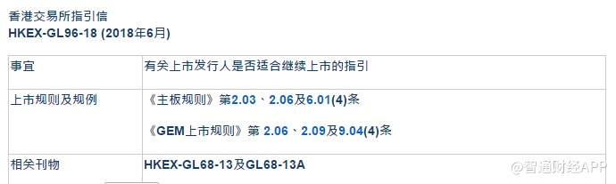 此外,关于上市发行人是否适合持续上市的指引信(GL96-18)中,列举了在哪些情况下联交所会质疑上市发行人或其业务是否适合继续上市。例如,若联交所怀疑发行人从事业务仅仅为维持上市地位,而非真正营运具有实质的业务,可能会质疑该发行人是否适合上市。