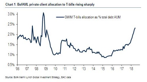 根据美银美林调查,过去一周,从美股以及相关ETF基金中的流出总额为242亿美元,处于历史第三高;从全球股市流出资金高达300亿美元,为金融危机以来单周流出最大金额。与此同时,投资者加速涌入避险资产美债,金额高达7亿美元。下图展示了,美银美林私人客户最近一段时间内对美债的押注突然大幅飙升。