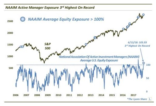 全国主动投资基金协会(NAAIM)是由注册投资顾问和基金经理组成,他们全部采取主动投资战略,不被动购买一揽子指数。根据最新的仓位调查报告,主动基金经理平均仓位达到104%,这意味着,他们不但all in,而且还加上了杠杆。这个比例是NAAIM调查12年以来第三高。
