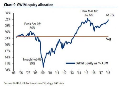 根据美银美林全球财富投资管理(GWIM)团队数据,其私人客户的现金配置比例已经跌至10%的历史低点,比金融危机前的2007年还要低1个百分点,也低于现金配置的历史平均值。股票仓位已达到61.7%,离2015年3月的历史最高点62.5%仅有一步之遥。下图蓝线代表私人客户股票仓位。