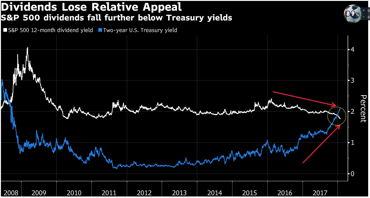 在过去12个月里,美债收益率稳步上升,现在无风险国债收益率和标普500股息收益率相差无几,甚至超过股息收益。二者之间差距拉大是因为,美国经济增长越来越强劲,美联储今年四次加息更是进一步推高利率。下图白线代表标普500指数12个月的股息回报,蓝线代表2年期美债收益率回报。