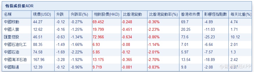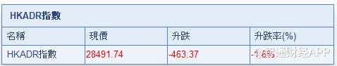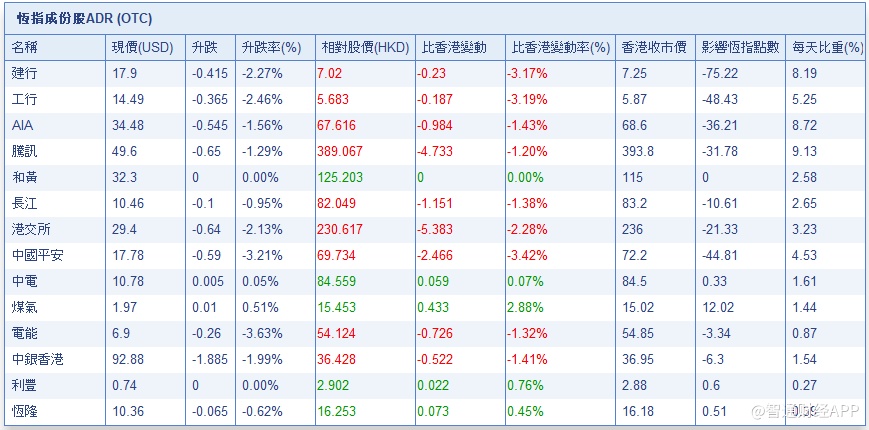 智通财经APP获悉,截至7月2日美股收盘,港股ADR指数全日受压,受A股大跌拖累,按比例计算,收报28491点,跌464点或1.63%。大型蓝筹全线表现疲弱,汇丰控股收报72.98元,较港收市跌0.62元;腾讯控股收报389.07元,较港收市跌4.73元。