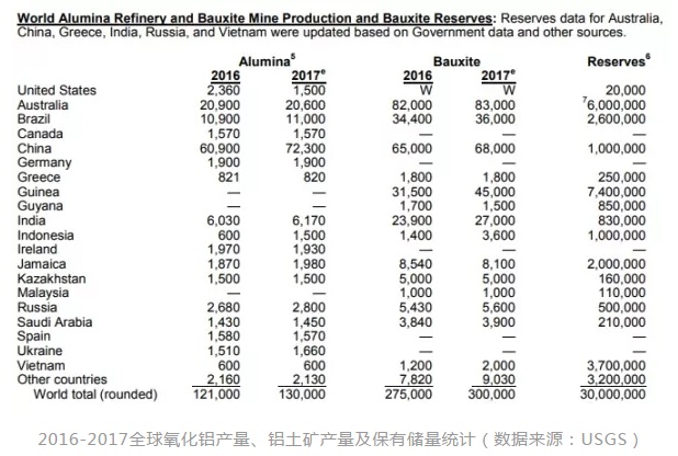就本文的主角铝土矿来说,根据美国地质调查局的数据,全球铝土矿储量约为300亿吨,其中几内亚储量占74亿吨,位居全球第一。