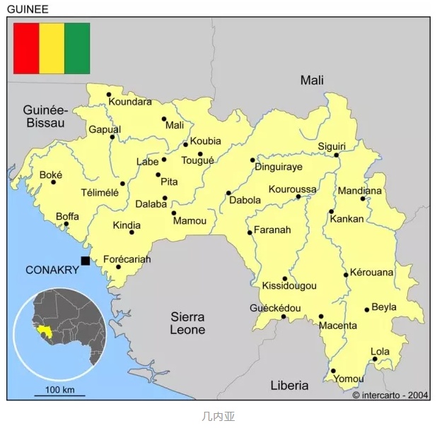几内亚全称为几内亚共和国,位于非洲中部的西海岸,几内亚湾以北,东南接科特迪瓦,南临利比里亚,西及塞拉利昂,北邻几内亚比绍、塞内加尔,北和东北与马里接壤。几内亚的首都是港口城市科纳克里(Conakry)。作为前法国殖民地,几内亚文化受法国影响较深,官方语言是法语,而由于历史原因,境内85%以上人口信奉伊斯兰教。