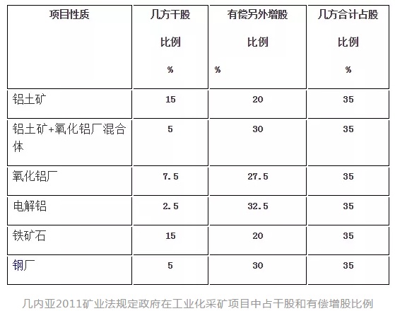 2011年的新矿业法出台后,招来国际矿业投资者的强烈批评,投资信心大受打击。2013年4月,几内亚政府在与矿产公司协商后,决定对矿业法部分条款进行修改:将出口铝土矿的矿产资源税从0.55%降为0.15%,工商税从35%降至30%。同时,对于矿产项目所需采掘装备的进口关税从8%降低为6.5%;铁矿和铝土矿探矿权证的面积从350平方公里增加至500平方公里,其他矿种从50平方公里增加到100平方公里。取得矿产特许经营权的资金要求也从10亿美元降低到5亿美元。
