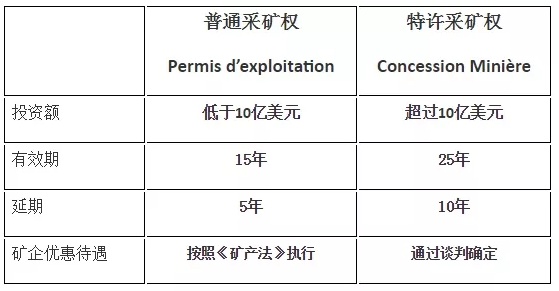 所谓特许采矿权(Concession Miniere),是几内亚矿业法中的一项特殊规定。一般项目申请普通采矿权,只能按照矿业法规定给予政府干股并按税率缴纳税金。而承诺投资超过10亿美元的重大项目,则可以通过谈判协商确定双方的权利和义务,从而享受一些优于法定的优惠待遇。