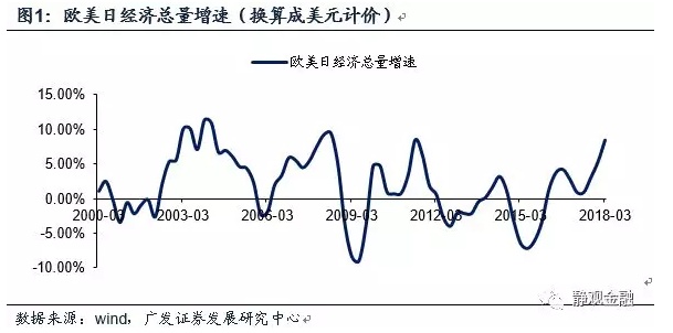 上半年海外宏观经济面回顾:2018年一季度欧美日实际GDP增速分别为2.5%、2.8%及1.1%,美国成为全球经济主要驱动力;若将欧美日三大经济体经济总量均换算成美元计价,图1所示,2018年一季度欧美日美元经济总量增速为金融危机后次高,8.46%。
