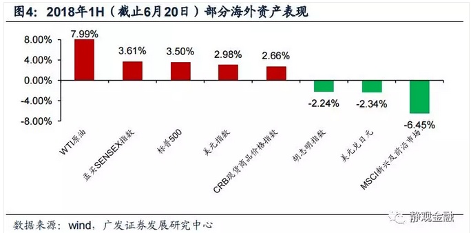 2018年上半年海外资产走势出现了较为明显的分化:原油与其他商品呈现分化;美元与非美汇率呈现分化;美股与非美权益呈现分化;发达经济体国债收益率均现上升,新兴市场则有所分化。资产价格的分化背后反映的是美国经济与非美经济边际运行方向的差异。