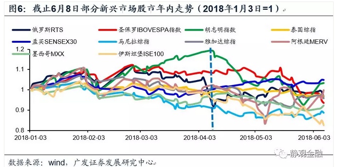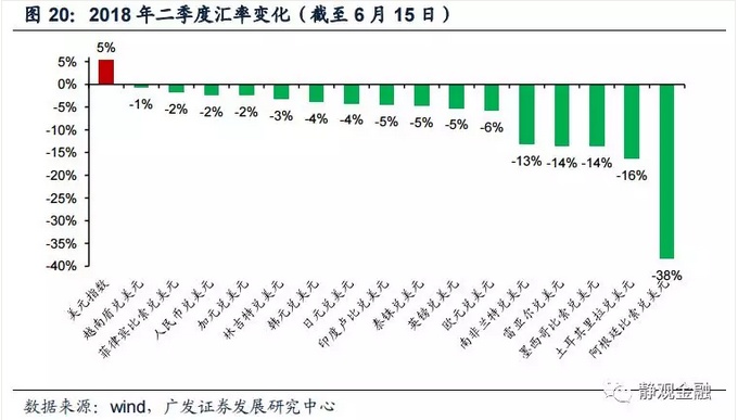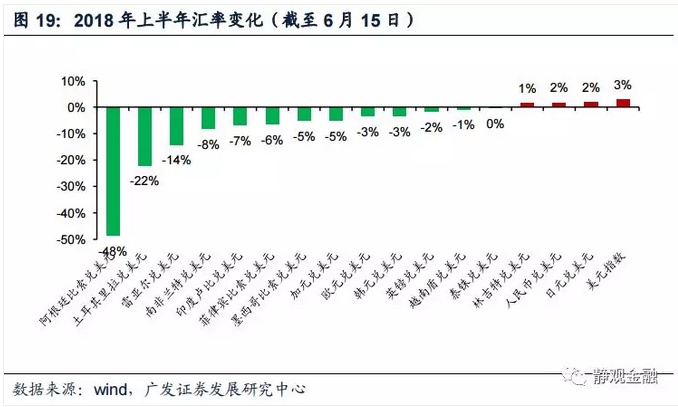 新兴市场风险或同处于可控阶段。上半年新兴市场风险是自身脆弱性、中美贸易摩擦及美元美债收益率同时大幅上升的结果。若以汇率变动作为度量衡,则上半年特别是二季度汇率贬值幅度明显超过同期美元升值幅度的主要新兴经济体包括阿根廷、土耳其、巴西、南非,二季度墨西哥汇率也出现显著贬值。