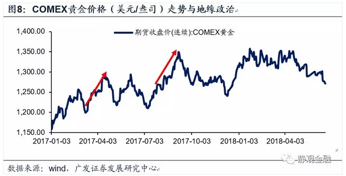 2018年4月,朝鲜则逐步表达了弃核意愿,朝韩两国领导人还于4月27日签署了《板门店宣言》。加上6月12日“特金会”的顺利推进,全球地缘政治风险出现了阶段性地、大幅缓和。与此同时,我们也看到4月11日起,黄金价格便进入震荡下行走势,日元兑美元也在明显贬值。换言之,超预期的、地缘政治风险的降温令安全资产遭弃。