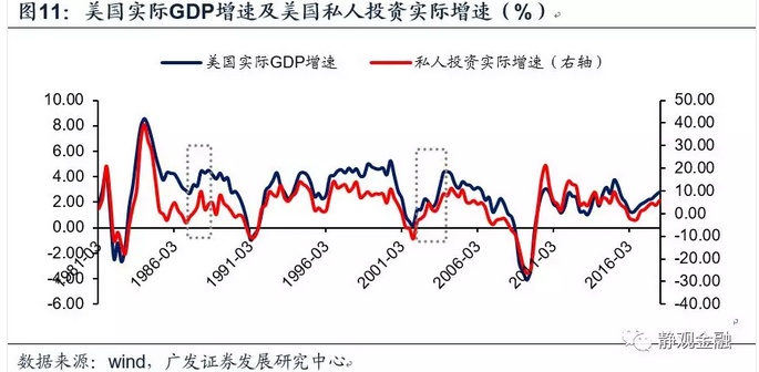 正如前文,2018年上半年美国经济增长动能来自房地产加速补库存和税改背景下的资本开支上升周期。在此背景下,2018年一季度美国实际GDP同比高达2.8%,二季度有望过3%。往后看,我们倾向于美国实际经济增长峰值可能出现在三季度,但与上半年相比,下半年美国经济增长动能存在边际(二阶导)增幅放缓的可能性。