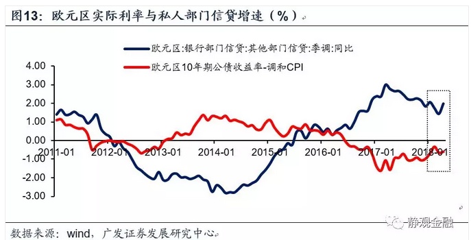 2014年2H到2017年欧元区经济回升来自两个动力:实际利率回落及外需回升。2014年6月欧洲央行实施负利率后,欧元区实际利率从高位快速、大幅回落,叠加随后的长期再融资操作(LTRO)和量化宽松,欧元区私人部门投资意愿显著改善、信贷增速大幅回升;2016年下半年至2017年中美经济改善给欧元区带来了较好的外需环境,叠加2011-2016年欧元大幅贬值,净出口对欧元区经济形成了明显提振。