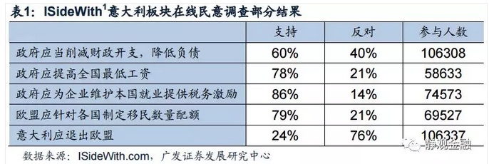意大利:短期内脱欧概率低;无外部冲击债务危机也难以发生。2016年6月24日英国脱欧公投后,由于英镑贬值和政治不稳定性导致英国陷入经济滞胀,呈现了极差的示范效应。此外,民调显示意大利大部分民众仅是希望解决经济和移民问题,对欧盟仍有较强归属感,脱欧暂不符合意大利民意。因此,短期内意大利脱欧概率极低。