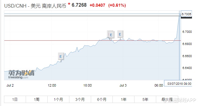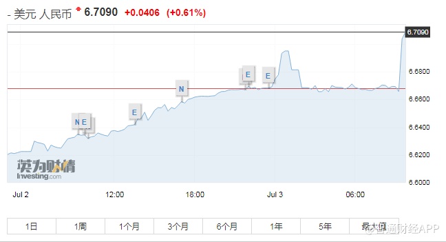 智通财经APP获悉,7月3日,亚市早盘离在岸人民币纷纷大跌400点,离岸人民币兑美元自2017年7月以来首次跌破6.7关口,随后一连跌破6.71、6.72、6.73关口。