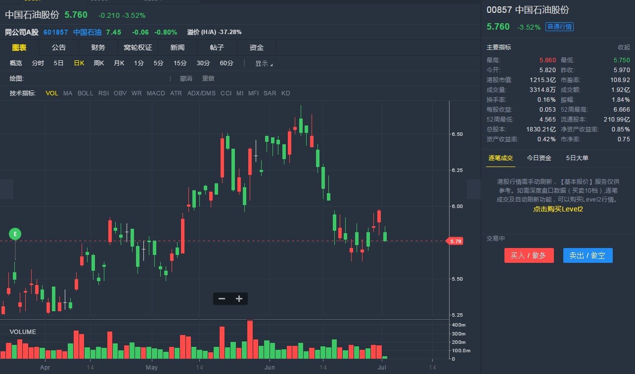 截至7月3日10:06,中石油跌3.52%,报5.76港元。