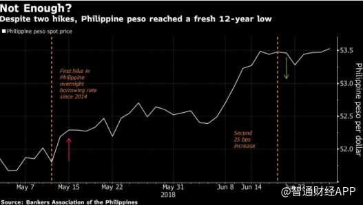 美联储升息、强势美元、油价走升以及对全球贸易战的担忧,皆使新兴市场承受更多压力。如印尼央行在5月的两周内进行了两次升息,但由于美国和中国的贸易紧张局势不断升温,印尼卢比再次承受压力,在28日跌至自2015年10月以来的最低点,29日暂报1美元兑14377.6卢比;菲律宾央行将利率上调至3.5%,仍难阻止货币贬值颓势,菲律宾比索兑美元跌至12年以来最低点,29日暂报1美元兑53.4130比索;阿根廷央行在5月初将基准利率上调至40%,共升息达1275个基点,以支持暴跌的比索,但支撑力仍然有限。