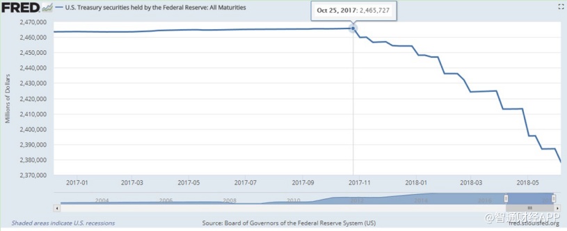但我之前提出过,美联储持有的美国长短国债的图表,由2017年10月开始到2018年5月31日当周计,美联储由USD2465727000000减至USD2387103000000。为期7个月,即每个月约100亿美元,比之前公布的60亿为高。