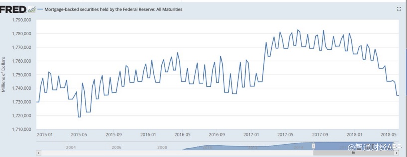 其次为按揭抵押债券(MBS),因为MBS支付不同于一般债券的特殊性,有时减债的传递会出现2-3个月的延迟,才能真正反映在资产负债表上。由2017年10月计到2018年5月,共减少约480亿美元,即每月减少约68亿,也就是每个月减少了168亿美元的速度缩表。