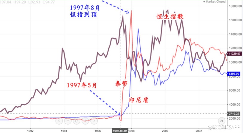 而我相信,如果下半年的美元持续加息及加快缩表,新兴市场问题将会持续及恶化。参考97年的经验,当时先由一些弱小的经济体如泰国等出事,之后再波及其他经济及外汇储备比较好的国家或地区,如亚洲四小龙的中国台湾,新加坡及中国香港等。这次笔者预期也不例外。泰币及印尼盾在1997年5月出事(如上图),恒指因资金从这些国家套现而获得资金流入,之后再因问题恶化,在同年1997年8月见顶,10月正式发生问题。所以笔者认为一旦今年新兴市场出事,香港很难不会受到波及。