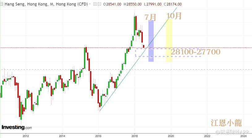 港股跌幅进一步扩至964点或3.3%,报27990。笔者预期恒生指数在7月底8月初会找到一个底点,目前其中一个关口是在28100点-27700点,之前提出的江恩转势日如6月25日及29日都算正确。但不论如何,目前必须留意7月7日的江恩转势日,如果7月7日之前上升,那小心之后大盘会再一次向下跌,反之亦然,也就是如果7月7日之前在底点,恒指可能先反弹一波,之后再一次回调直至7月尾至8月中。一旦跌穿27700点,将见26500-25300,这或是7月的目标。