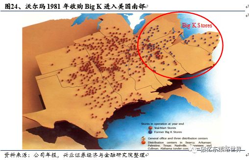 依托配送中心进行外延扩张,并购进军全国。1981年,由于美国零售业竞争激烈,很多企业出现亏损。沃尔玛趁机收购了一家总部位于田纳西州的南部地区的折扣百货连锁公司Big K。该公司在美国东南部势力强大,分布在9个州,共有120家分店。沃尔玛上演了一幕“蛇吞象”的大戏。通过此次收购,沃尔玛借机进入了美国南部,实现了公司在地域上的一次突破,沃尔玛的分店达到349家,分布在美国13个州,销售收入跃升至24亿美元,成为全美第二大折扣百货连锁公司,直逼第一的凯马特。此外,这也使得沃尔玛赶在了凯马特之前进入南部地区。此次并购还使沃尔玛获得了并购较大公司的经验和信心。此后,公司即以每年100家,有时甚至是150家分店的速度急剧扩张,其中相当部分是通过并购实现的。