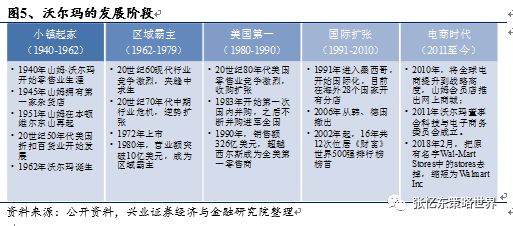 我们分阶段回顾了沃尔玛的发展史。1)1962-1979:乡镇小店到区域霸主。通过“天天平价(Everyday Low Price)”吸引顾客,在小镇这样一个缺竞争、有需求、低成本的环境中悄然成长,做到区域垄断,成为最大的区域零售公司。2)1980-1990:成为美国第一。围绕配送中心以逐步填满的方式迅速扩张,在城乡结合部开店,向全国扩展;在行业危机中强化供应链管理,实行低价策略,保持高景气度,实现真正的飞跃。3)1991-2010:国际扩张。美国零售市场发展趋于饱和,依靠拓展国际市场推动公司持续发展。4)2011至今:电商时代。将全球电商提升到战略高度,大规模收购Jet.com、Flipkart等电商,向平台方向转变,与亚马逊开始直面竞争。