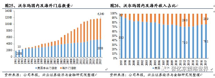 海外门店占比逐年攀升。在全球化扩张的背景下,沃尔玛海外门店数量急速攀升,从1991年开始海外扩张以来,海外门店占比逐年提升,1992年,沃尔玛海外商店的数量只有10个,还不到全部商店数(2,148家)的0.5%,到2017年,海外商店数量达到6,360家,分布在全球28个国家,占总店数(11718家)的54%。但公司的营业收入仅有23.9%来自其海外,主要由于汇率等原因,海外门店店均收入贡献明显不及本土。